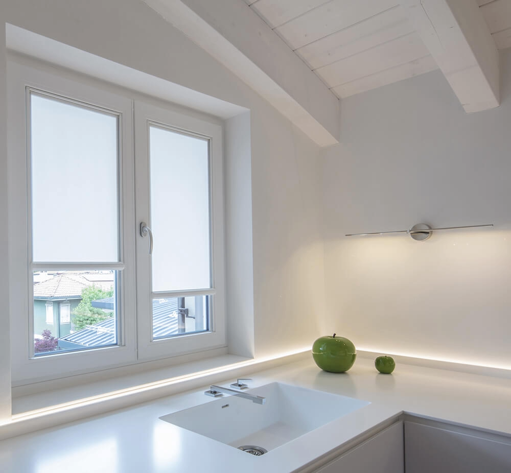 Valorizziamo gli interni con tessuti naturali per trasformare la luce in arredo.