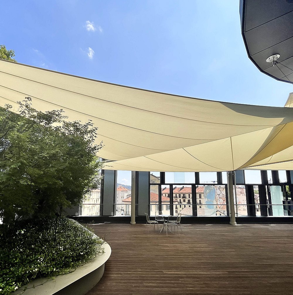 Il progetto si articola in tre aree distinte, collegate da percorsi sinuosi che accompagnano il visitatore attraverso spazi verdi e visuali aperte sulla città. Le vele da sole Tralli sono realizzate con materiali di alta qualità, resistenti e durevoli, capaci di garantire un’omogenea protezione solare e di valorizzare la terrazza con linee sobrie e contemporanee. Ogni dettaglio è stato studiato per integrarsi con l’architettura e con il linguaggio materico della Nuvola Lavazza.